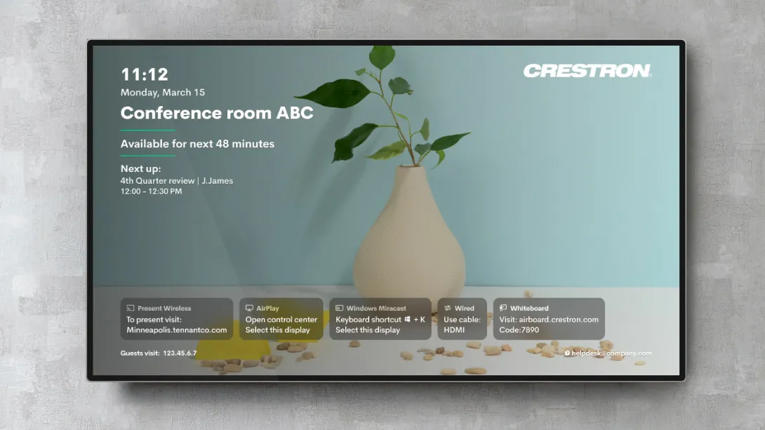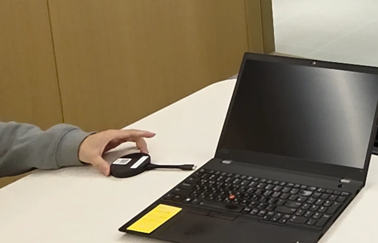 회의실 디스플레이에 문서 공유 화면을 확인해주세요. 디스플레이가 자동으로 켜집니다. 켜지지 않는 경우 전원 버튼을 눌러주세요.